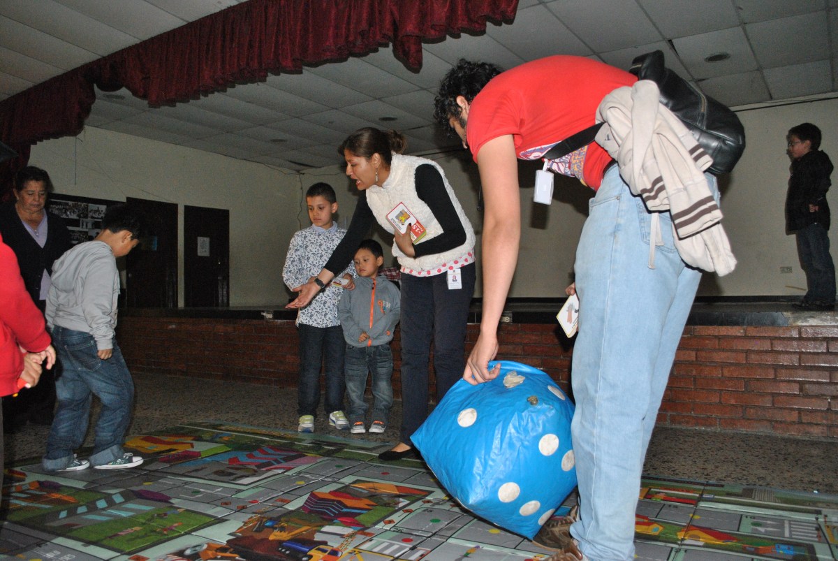 Niño da pasos adelante sobre el juego de Gran formato, animado por los pedagogos de la Secretaría Distrital de Movilidad. Fotografía: Paola Méndez, Dirección de Seguridad Vial y Comportamiento del Tránsito.