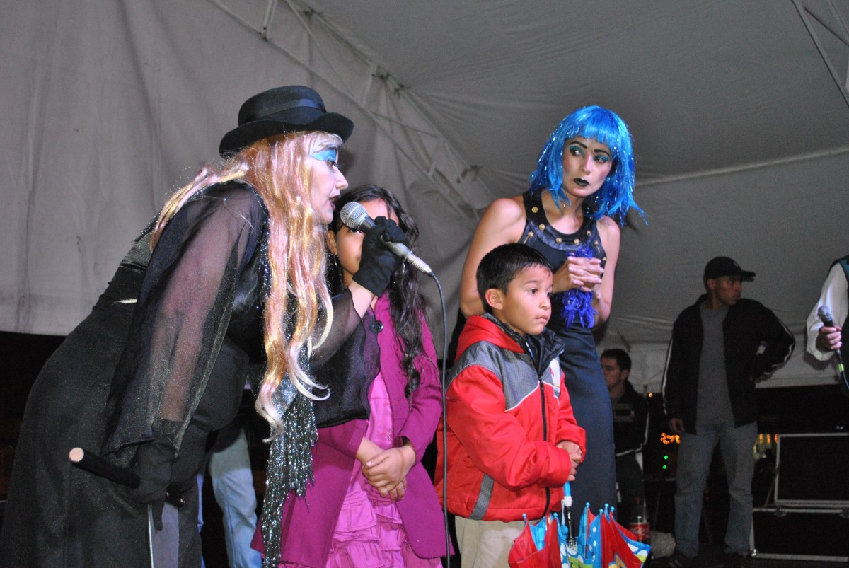 Pareja de niño y niña a la expectativa con pedagogas-actrices en la puesta en escena de «Invisibles en la vía» de la Secretaría Distrital de Movilidad, en el marco de la campaña Amor en la vía, regalo para Bogotá de Navidad. Barrio La Ponderosa, Bogotá. Fotografía: Paola Méndez, Dirección de Seguridad Vial y Comportamiento del Tránsito.