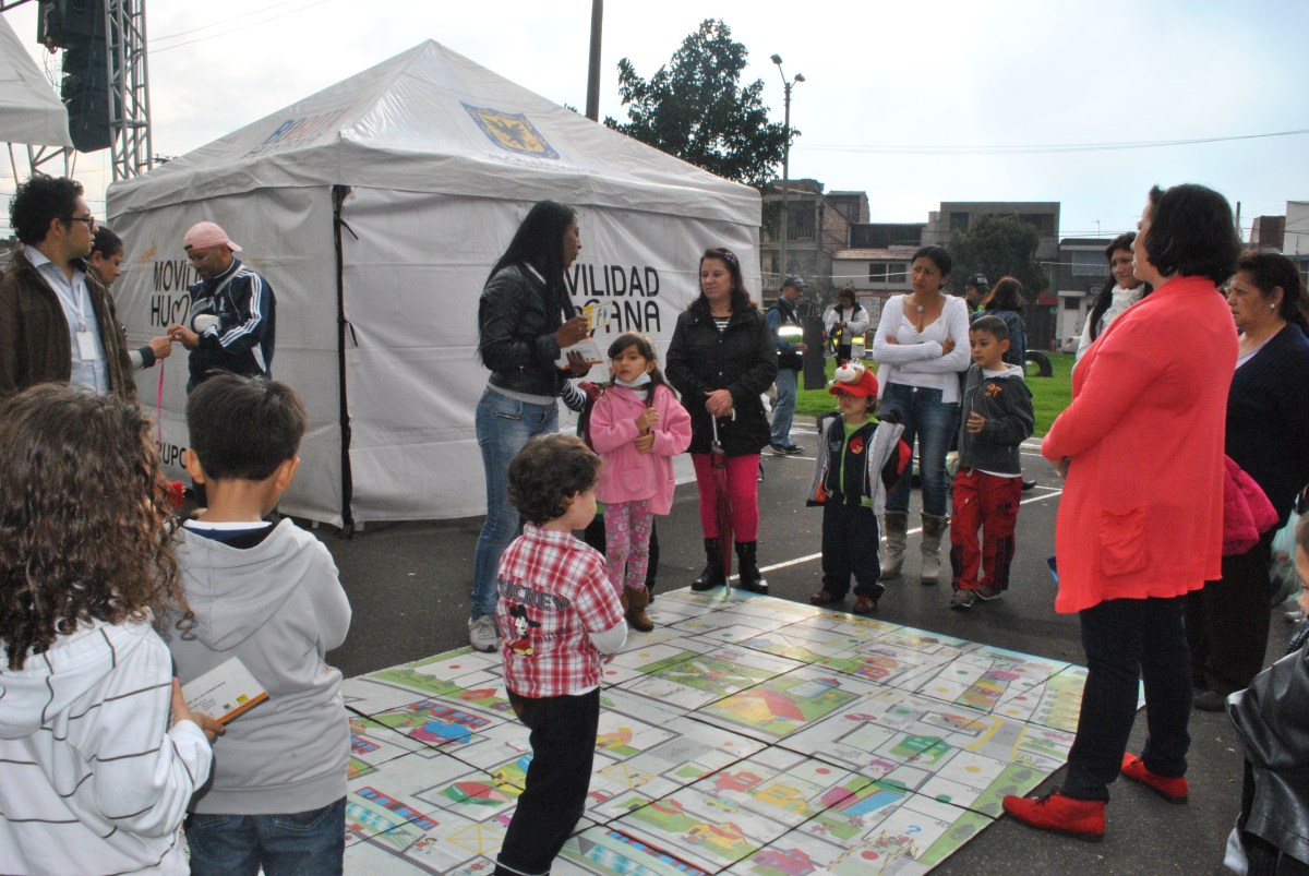 Pedagoga de la Secretaría Distrital de Movilidad explica a niños y adultos las reglas del juego de gran formato. Fotografía: Paola Méndez, Dirección de Seguridad Vial y Comportamiento del Tránsito.