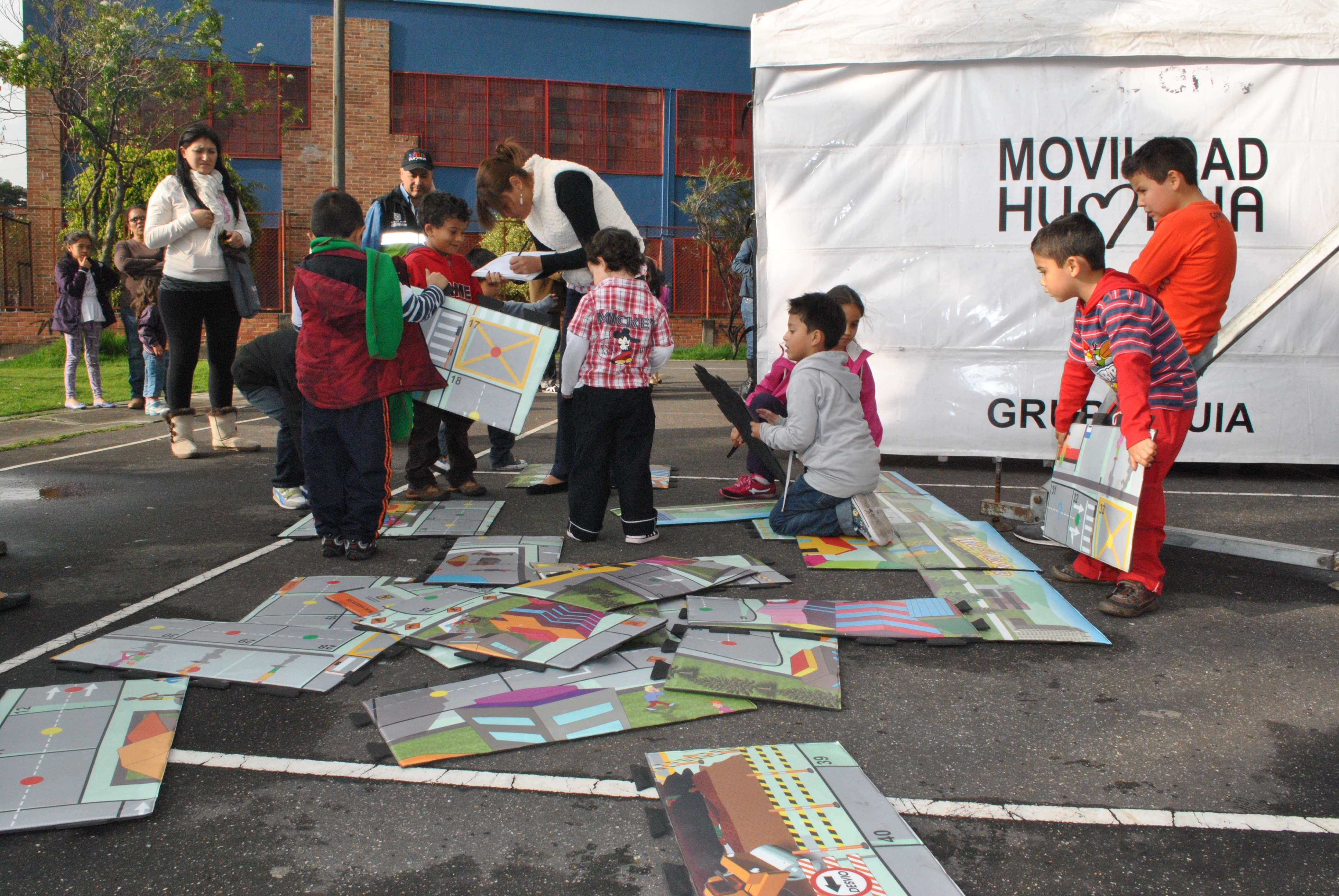 Pedagoga de la Secretaría Distrital de Movilidad organiza un rompecabezas gigante con niños y niñas del Barrio La Ponderosa en Bogotá. El rompecabezas armado es la plantilla de gran formato sobre la que jugarán los niños y niñas. Fotografía: Paola Méndez, Dirección de Seguridad Vial y Comportamiento del Tránsito.