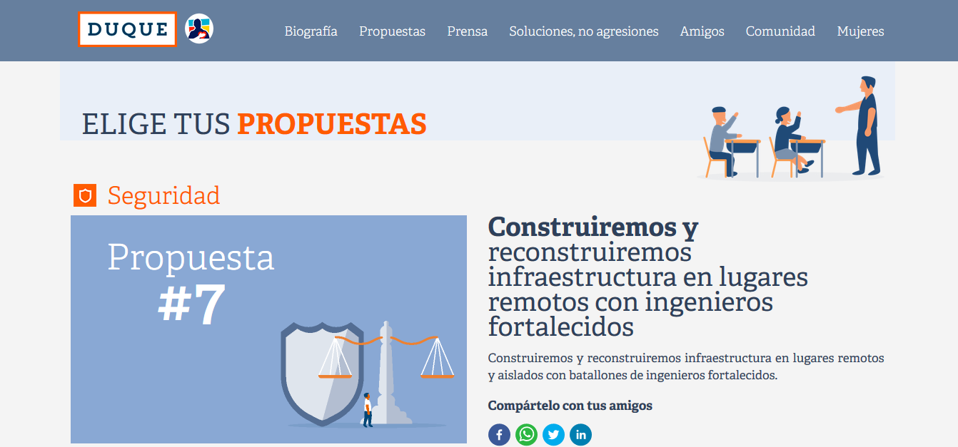 Su propuesta se titula específicamente “Infraestructura” y está consignada en un documento descargable en formato PDF de 15 páginas. En él plantea su visión de un país conectado, competitivo y transparente. Plantea la necesidad de consolidar el proceso de paz con infraestructura que les permita a los campesinos sacar sus productos, y al país proyectarse a los mercados internacionales a costos razonables.
