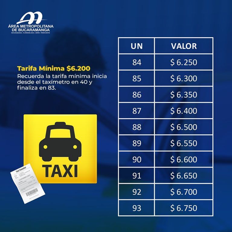 Para la ciudad de Bucaramanga y su Área Metropolitana, la carrera mínima en taxi se incrementó en $500 frente a la vigente en 2022 para quedar en $6.200. La vigencia inició el 1 de enero de 2023. El recargo nocturno autorizado se hará efectivo únicamente en el horario comprendido entre las 08:00 p.m. y las 4:59 a.m. del siguiente día. El valor de los servicios desde y hacia el aeropuerto será el resultado de la suma de lo determinado mediante el uso taxímetro y el recargo único de $19.000.